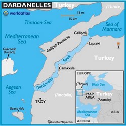 1915: First Lord of the Admiralty, Winston Churchill, desired to open a second front against the Germans. In early March he was determined to seize the Dardanelles Straits and Constantinople from the German ally, Ottoman Turks. The Turkish fleet was at the time bombarding Russian coastal cities on the Black Sea. Thus two purposes would be served. A second front against the Germans to divert some of their resources from the European Western front in France, and to relieve the Entente's Russian ally from Turkish pressure. In conjunction with French and Australians Churchill commenced the sea campaign.