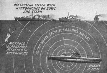 Technology provided an additional method for locating a submerged submarine. The destroyers were fitted with hydrophones (early sonar) on their bow and stern which could pick up sound waves from the submarines motors. Three boats acting in concert, could by triangulation pin point the exact location of the U-boat. The depth charges would follow.