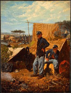 The Union soldier was relatively self sustaining in the field. Aside from the clothes he wore and his weapon, food, utensils, clean socks, shelter were carried in his knapsack. Famed artist and on the field observer, Winslow Homer, caught it all in his "Camp" painting. The knapsack is seen hanging, and almost defies science because of the amount to be stuffed in such a small bag. the "Home Sweet Home" title was also the title of music played by the infantry regimental band. This iconic painting is a fit manner to conclude the discussion of the Union uniform.