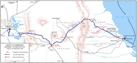After Winfield Scott made landfall, he commenced a siege of Vera Cruz (pictured below) on March 9. His staff officers, Robert E. Lee, P.G. Beauregard and George B. McClellan, would burnish their own national reputations less than 15 years later. They opposed each other in blue an gray uniforms.