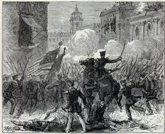 On September 12, in the early morning, the bombardment ceased. The defenders of the fort, about 800 hardened soldiers and 300 teen age cadets, readied for the American assault. The knew they were the last line of defense of the city. American infantry and marines rushed the wall with scaling ladders. The climb was about 14 storeys high. Mexicans, above, fired point blank at the climbers. Americans scaled the walls and hand to hand combat ensued. Nearly all of General Bravo's forces were mercilessly hacked to death. The few remaining cadets threw themselves from the wall in a mass suicide rather than submit to the Yanquis. They are now memorialized as the "Boy Heroes" ----Los Ninos Heroes.
