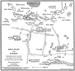 General Shafter chose to lay siege to Santiago City rather than continuing the attack which might have brought the war to a close on that July 1, 1898. He was suffering from malaria (and gout), and his men that survived death and wounds were heat exhausted. He evidently had overestimated the strength of the Spanish defenses, and still was demanding that Admiral Sampson enter the harbor and engage the Cervera fleet.