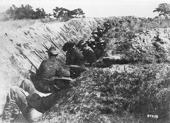In the early morning hours, two American divisions occupied trenches at the foot of the San Juan Heights taking fire from above. They awaited General Lawton's regiments to conclude operations at El Caney. During that unexpected waiting period, no orders from the General staff were received to advance. Apparently the high command also awaited the successful outcome at El Caney. In the interim, time was on the side of the Spaniards in their well fortified blockhouse on the summit of the San Juan Hill as named by the Americans.
