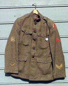 The parameters for the war uniform were provided by the Regulations of 1908: the blue fatigue (work) uniform of blue denim and winter wool coat, double breasted and six buttons. The work uniform replaced the brown canvas material that had seen long service. As the case with the tunic, the heavy wool garment was worn by all ranks. The only obvious difference would be the insignia displayed,and black band of the officer on the bottom of the sleeve. Old, visual divisions of class and rank were minimized.