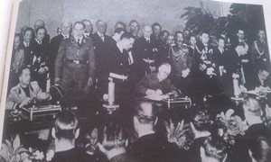 In March 1938, Adolph Hitler's Nazi Germany annexed (anschluss) neighboring Austria and was welcomed by its population. Less receptive was neighboring Czechoslovakia, but too weak to offer resistance to a German invasion (March 16, 1939). That country was abandoned by Great Britain and France who believed that Hitler's appetite was satisfied with this conquest. Prime Minister Neville Chamberlain sold that message to the English people in a moment of wishful thinking. Thus it is fitting to begin a photo tour of World War 2 with this honorable gentleman who henceforth was known for his injudicious policy of appeasement.