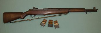 United States: By 1945, the standard rifle was the 9 lb Garand M1 (John Garand) with a maximum range of 5500 feet. The rifle was semi automatic and self loading. It was gas operated and fed with an 8 clip .30 caliber cartridge. Its sight was extremely accurate and the gun unaffected by weather. The butt carried swabs, brush and cleaning rod. Its simplicity was confirmed by every infantryman who could it tear it down and put it together in the dark. It was described as 9 plus pounds of terrific "knock down" power and never jammed.